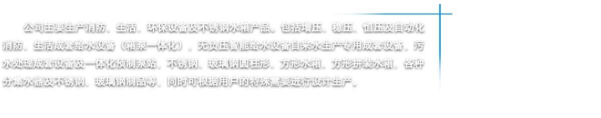 江蘇燁達環保設備有限公司坐落在江蘇省鹽城市建湖縣城,東臨黃海之濱,背倚蘇北平原,處于長三角經濟一體化和江蘇沿海開發兩個國家級戰略疊加區域內,素有“水鄉明珠”美稱。我公司鑒定走“產、學、研”相結合的路子,是江蘇省供水設備行業的大型企業。公司以“一流的管理,一流的研發設計,一流的質量意識,一流的售后服務”為宗旨,嚴格控制原材料質素,講求“品質是企業的生命力”的理念,嚴把質量關,從而為客戶提供優質的供水設備。公司主要生產消防、生活、環保設備及不銹鋼水箱四大類產品。包括增壓、穩壓、恒壓及自動化消防、生活成套給水設備(箱泵一體化),無負壓智能給水設備自來水生產專用成套設備,污水處理成套設備及一體化預制泵站,不銹鋼、玻璃鋼圓柱形、方形水箱、方形拼裝水箱,各種分集水器及不銹鋼、玻璃鋼制品等,同時公司可根據用戶的特殊需要進行設計生產。燁達人將以科學的管理、精湛的技術、可靠的質量、優良的品質向社會各界服務,我們始終坦誠相見,我們當然走在最前面······